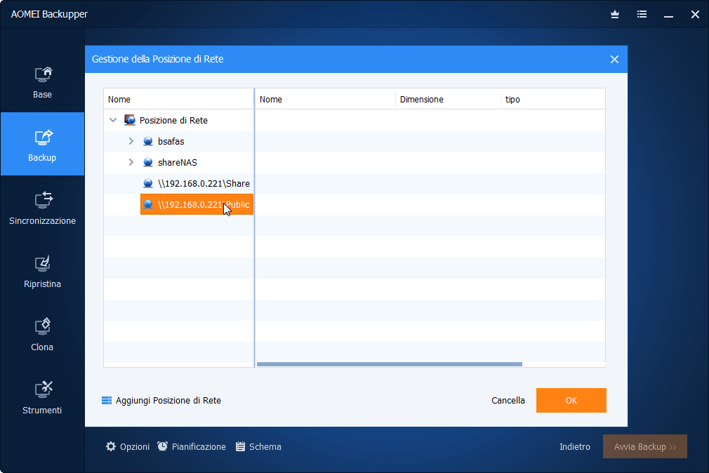 In questo esempio, l'immagine di sistema viene memorizzata nella cartella di rete condivisa. Fai clic su "Share/NAS" e inserisci le informazioni necessarie.