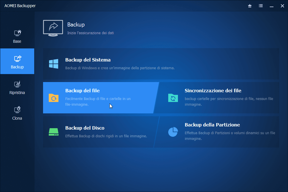 Per facilitare l'esecuzione del backup dei file, abbiamo bisogno del miglior software di backup dei file gratuito - AOMEI Backupper Standard. Oltre alla funzione di backup dei file, offre la funzione di sincronizzazione dei file che consente di sincronizzare tutte le cartelle locali su OneDrive.
