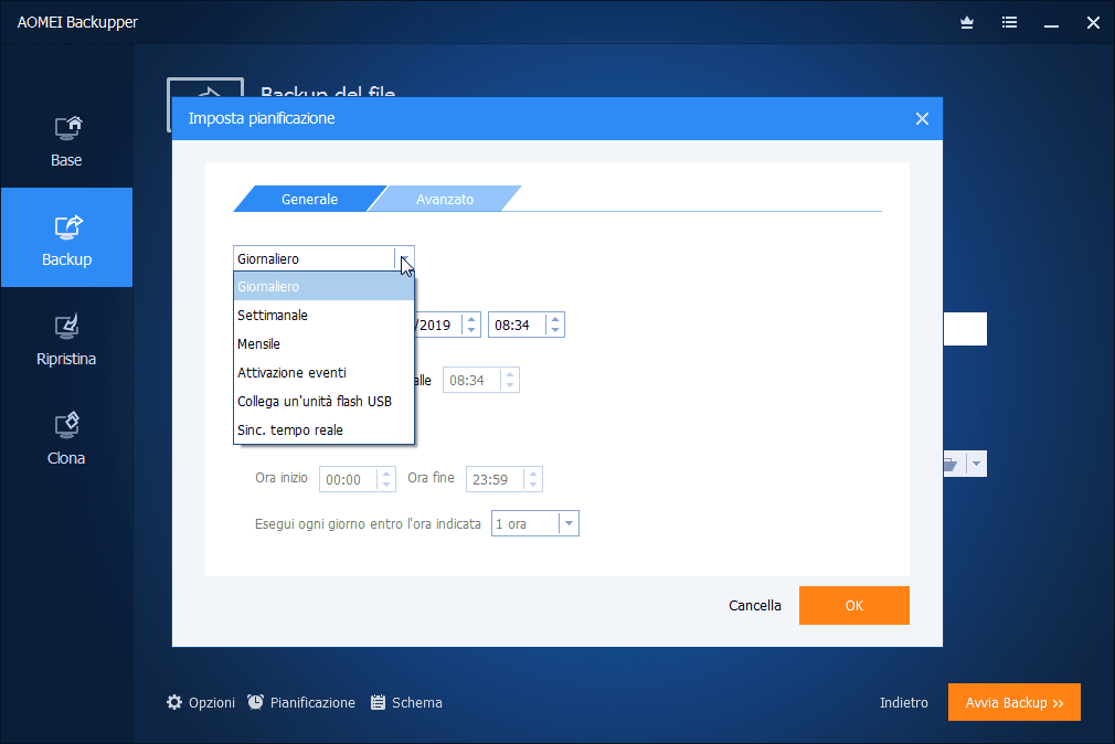 Step4. Spuntare Pianificazione in fondo. Nella finestra pop-up, imposta una frequenza di backup.