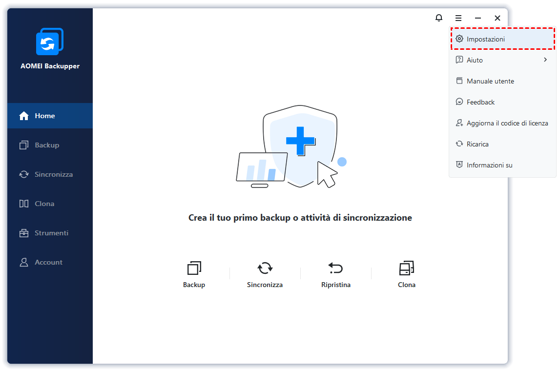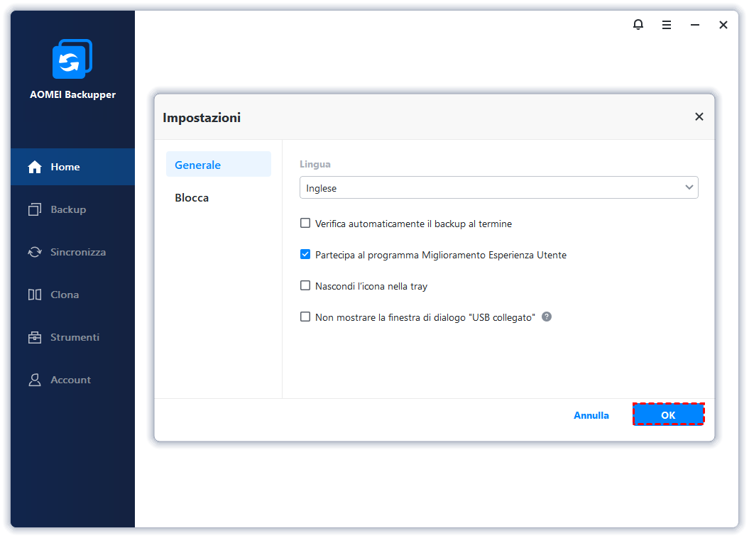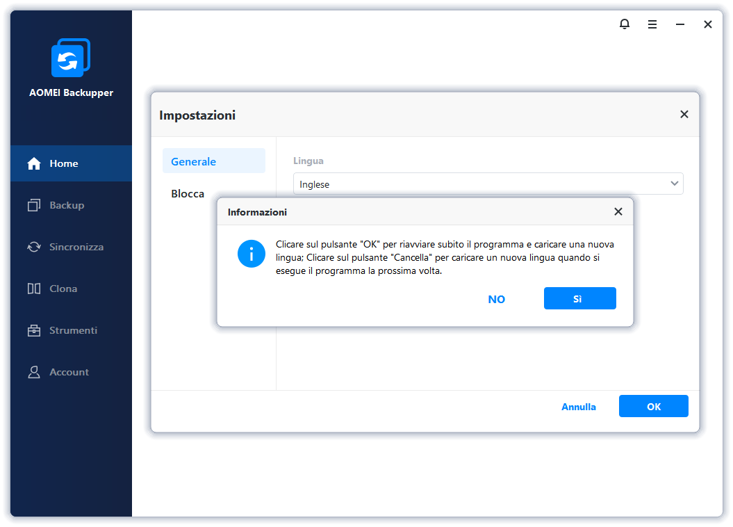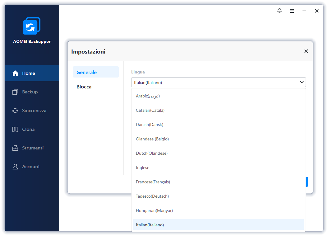 Buone notizie: Ad eccezione del sito Web italiano, AOMEI Backupper supporta molte altre lingue, include l'inglese (English), Tetesco (Deutsch), Frencese (Français), Spagnolo (Español), Giapponese (日本語), Cinese Simplificato (简体中文), Cinese Tradizionale (繁體中文) e Portoghese (Português). Se provi a impostarlo alla lingua nazionale, qui è come cambire la lingua.