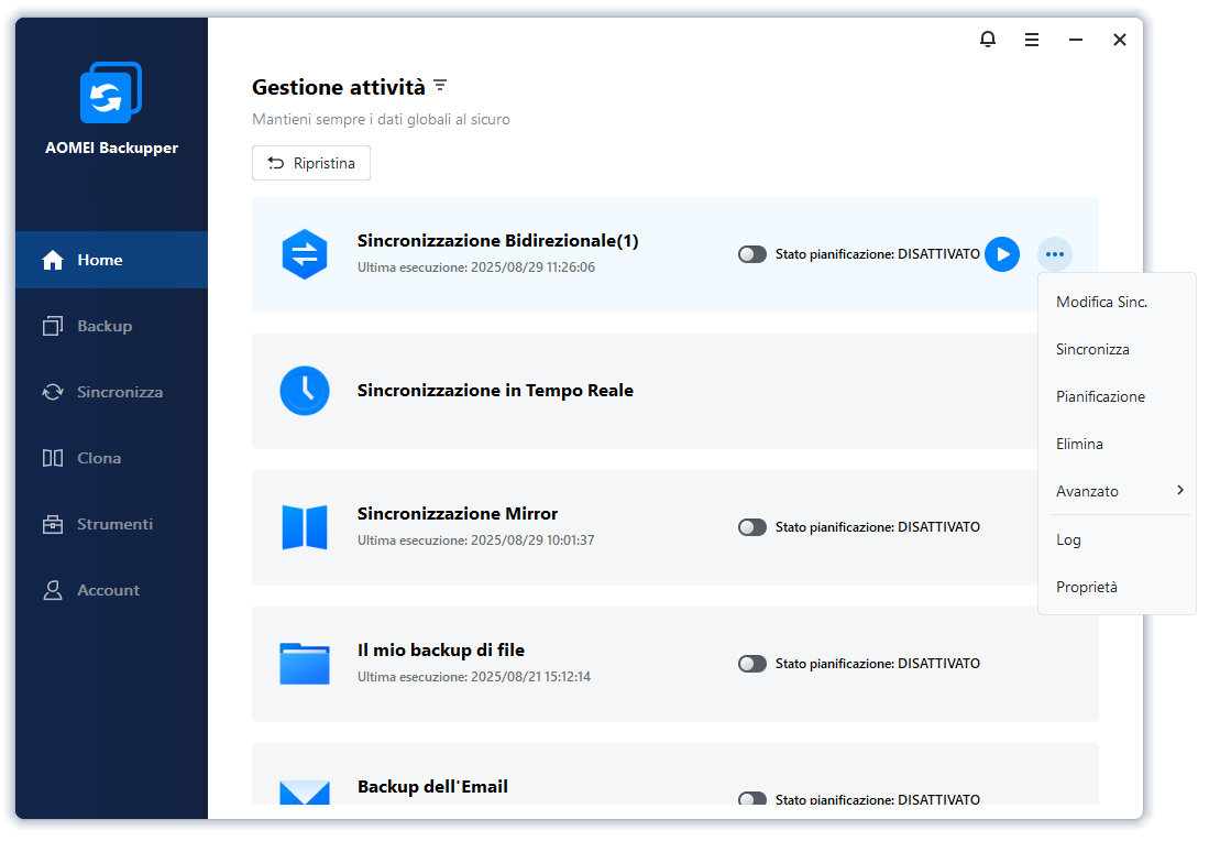Se hai creato un'attività di sincronizzazione bidirezionale ma non hai abilitato la funzione "Pianificazione", puoi abilitarla facendo clic sul pulsante altre opzioni nella interfaccia principale per renderla un'attività pianificata.