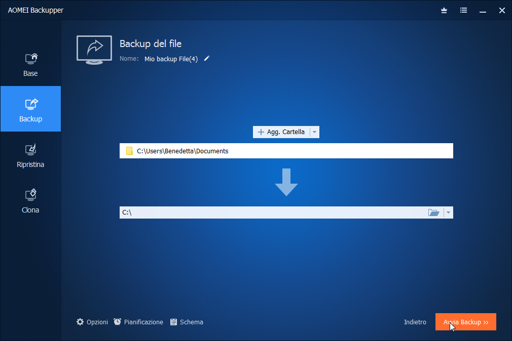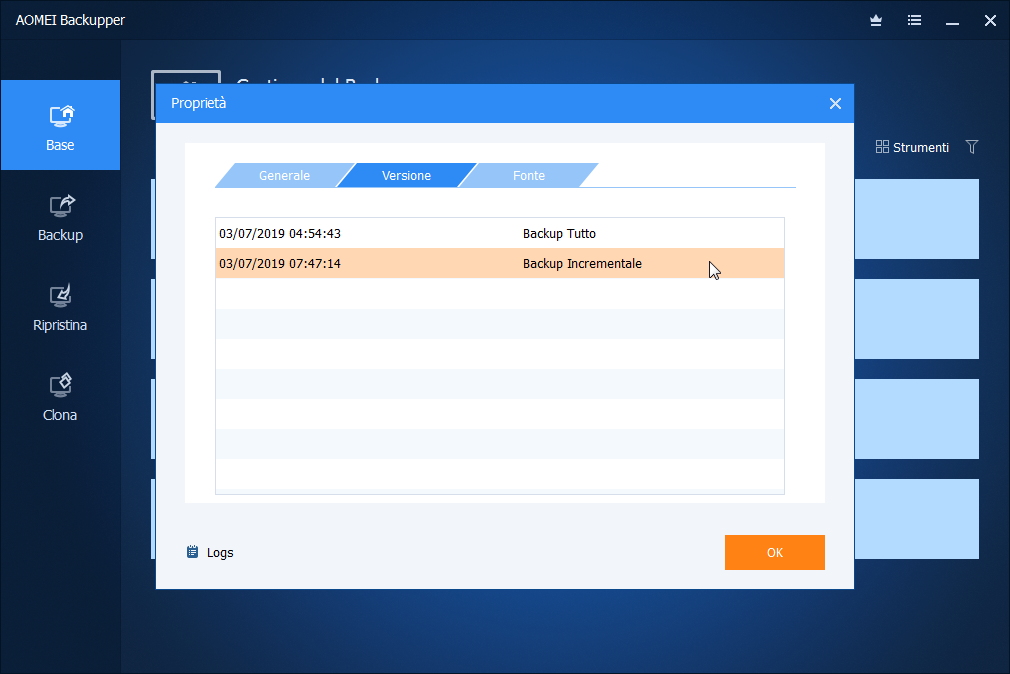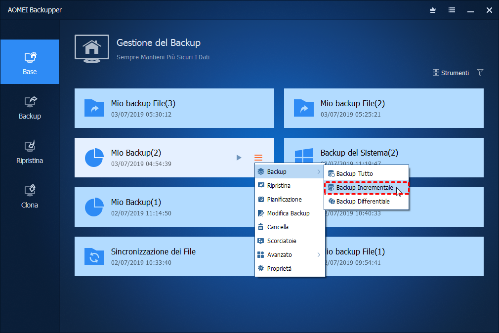 Backup incrementale e backup differenziale (per AOMEI Backupper Pro) sono opzioni dei tipi di backup, è possibile scegliere uno di essi per il backup di file e dati dopo il primo backup completo.