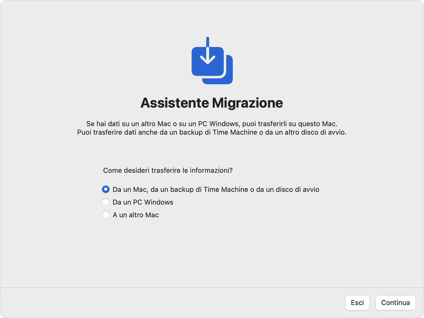 Passo 2: Accedi ad Assistente Migrazione sul tuo nuovo Mac, scegli Da un Mac, backup Time Machine o disco di avvio e clicca su Continua.
