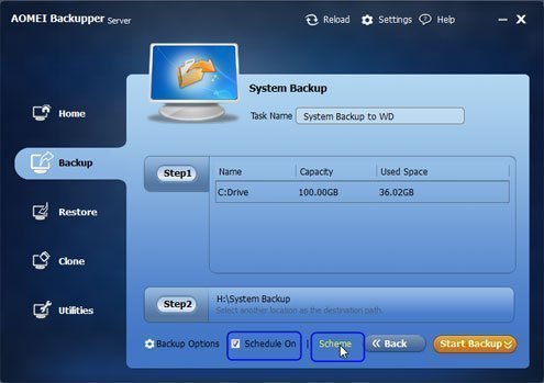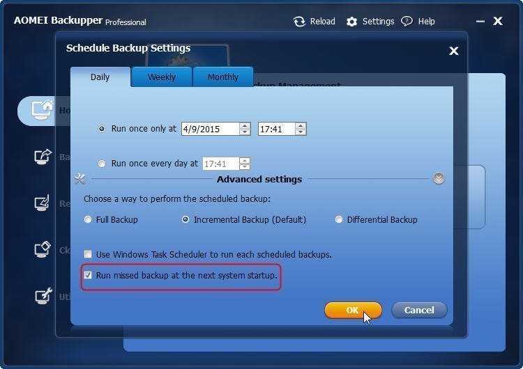 Impostare un programma di backup per eseguire il backup del sistema e dei dati in modo coerente e tempestivo. AOMEI Backupper può eseguire le attività di backup in modalità quotidiana, modalità settimanale o modalità mensile. Il backup periodico migliorerà notevolmente la sicurezza dei PC e dei server Windows.