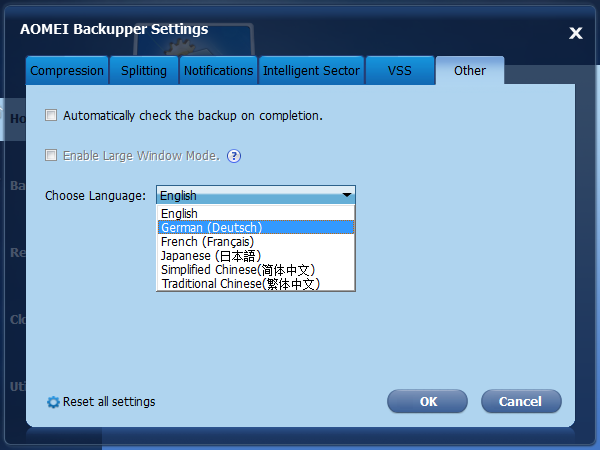 Supporta Inglese, Francese (Français), Tetesco (Deutsch), Jiapponese (日本語), Cinese Semplificato (简体中文) e Cinese Tradizionale (繁體中文). Scopri come cambiare la lingua AOMEI Backupper >>