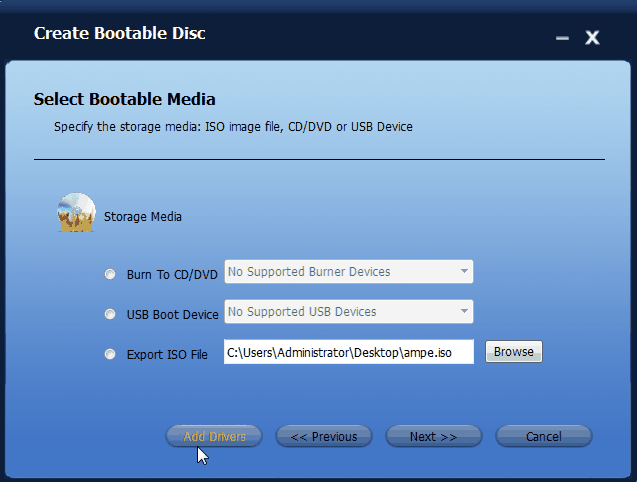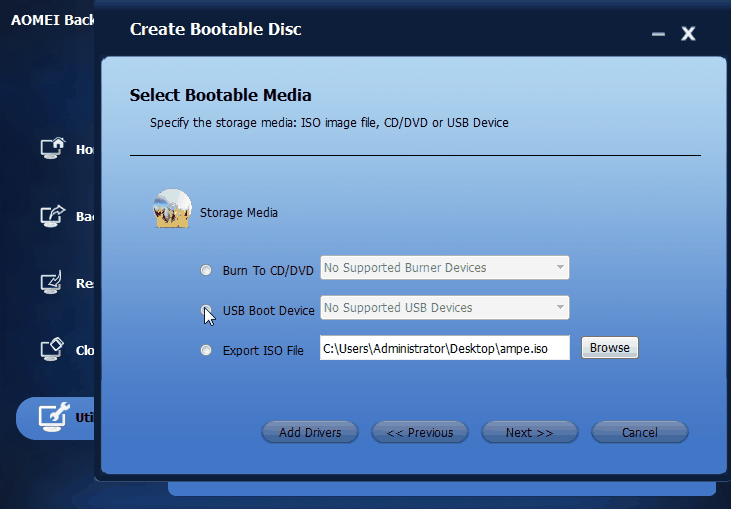 Questa nuova funzione consente agli utenti di creare direttamente un'immagine di avvio di AOMEI Backupper e quindi masterizzarla su un'unità flash USB o su un disco rimovibile USB. In questo modo, è possibile utilizzare l'unità USB per avviare il computer per eseguire il backup o il ripristino senza accedere a Windows.