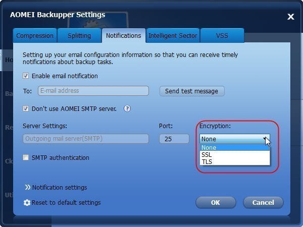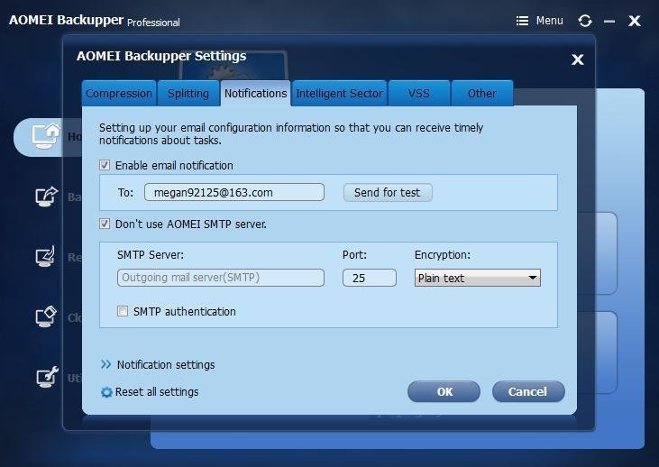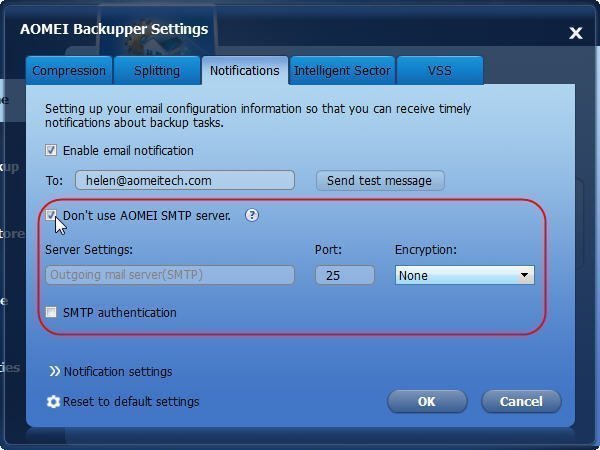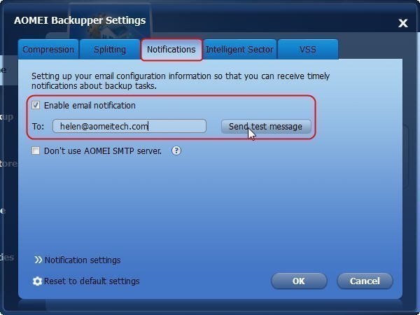 Supporto per inviare notifiche tramite il server Web di AOMEI e il modulo SMTP integrato nel programma.