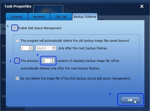 Permette di eseguire la gestione dello spazio su disco. Durante o dopo un backup, AOMEI Backupper può eliminare automaticamente vecchi backup per liberare spazio su disco per nuovi backup basati sui meccanismi. [Pagata]