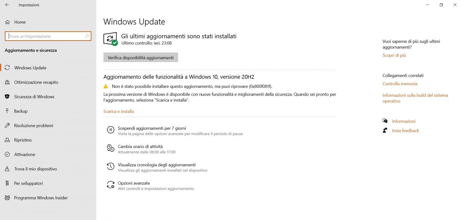 Vai su Impostazioni sul tuo computer > Scegli Aggiornamento e sicurezza > Windows Update e assicurati che il tuo computer sia aggiornato con tutti gli aggiornamenti di Windows installati.
