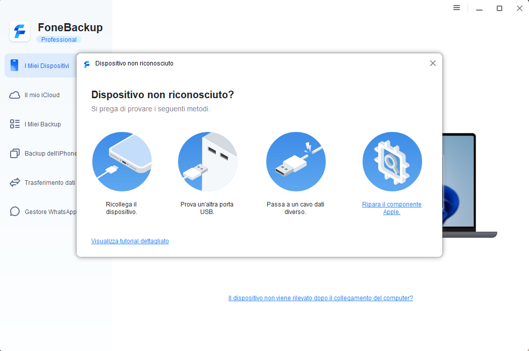7. Se il dispositivo è collegato correttamente ma AOMEI FoneBackup non riesce ancora a riconoscerlo, prova a utilizzare la funzione di riparazione dei driver di AOMEI FoneBackup per verificare se ci sono problemi con il driver di AOMEI FoneBackup.