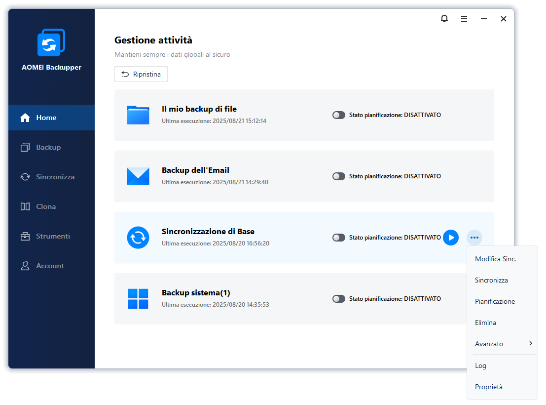 Parlando di software di sincronizzazione, qui consigliamo vivamente AOMEI Backupper Standard, che ha potenti funzioni per quanto riguarda la sincronizzazione dei file.