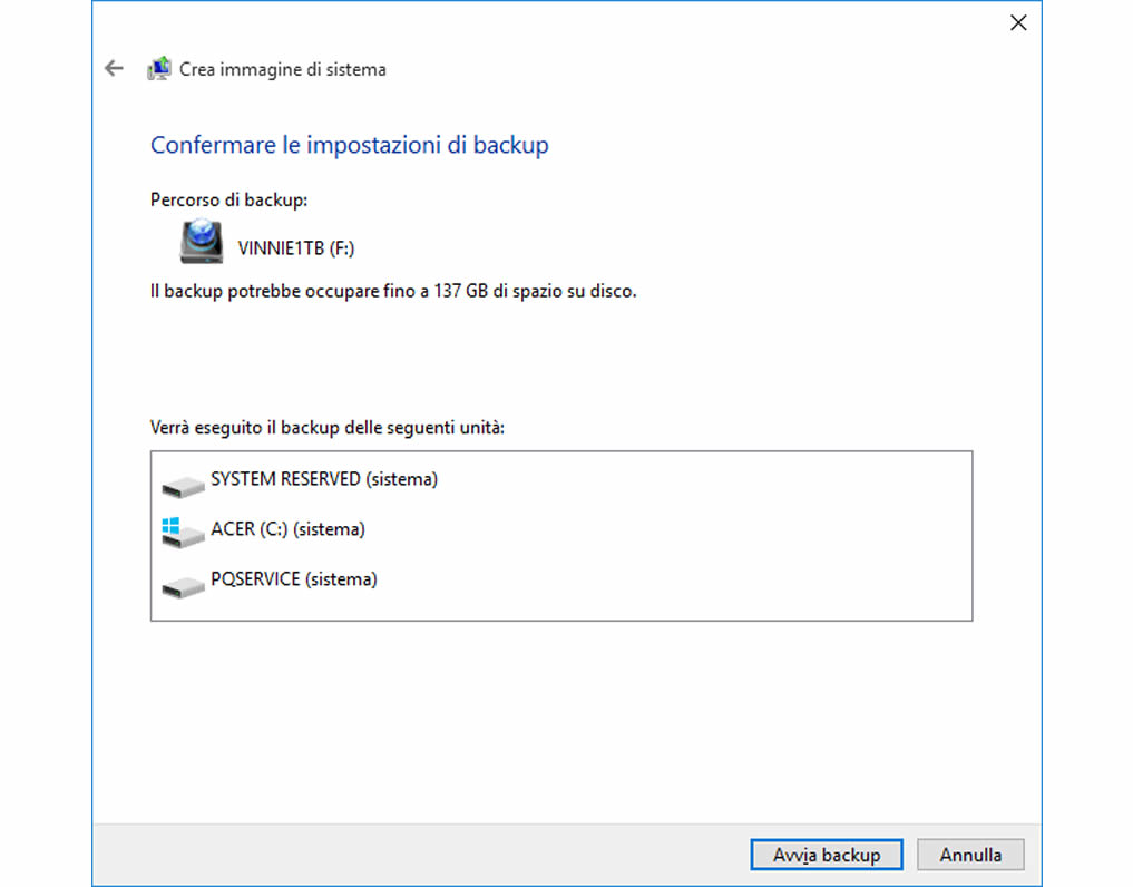 In Windows 10, è possibile utilizzare il vecchio strumento di backup e ripristino (Windows 7) per eseguire il backup dei dati, incluso il profilo utente. Si consiglia di eseguire il backup su unità di rete, disco rigido esterno o altra posizione fuori sede.