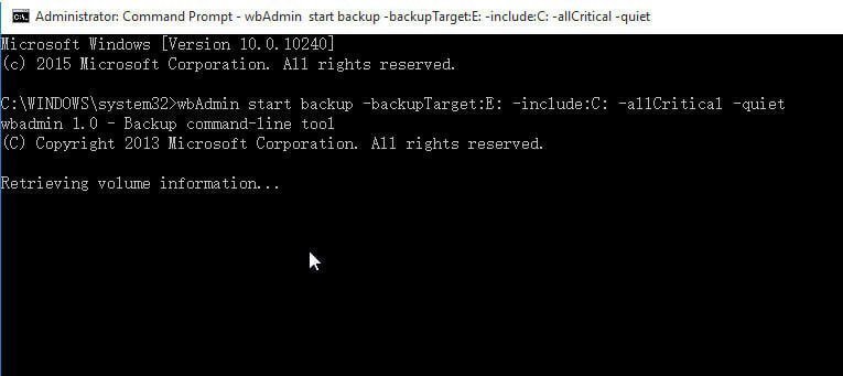 - Digita WBadmin start backup -backupTarget:E: -include:C: -allCritical –quiet e premi il tasto Invio. (Sostituisci E con la letterà di unità del tuo disco selezionato per archiaviare immagine di sistema)