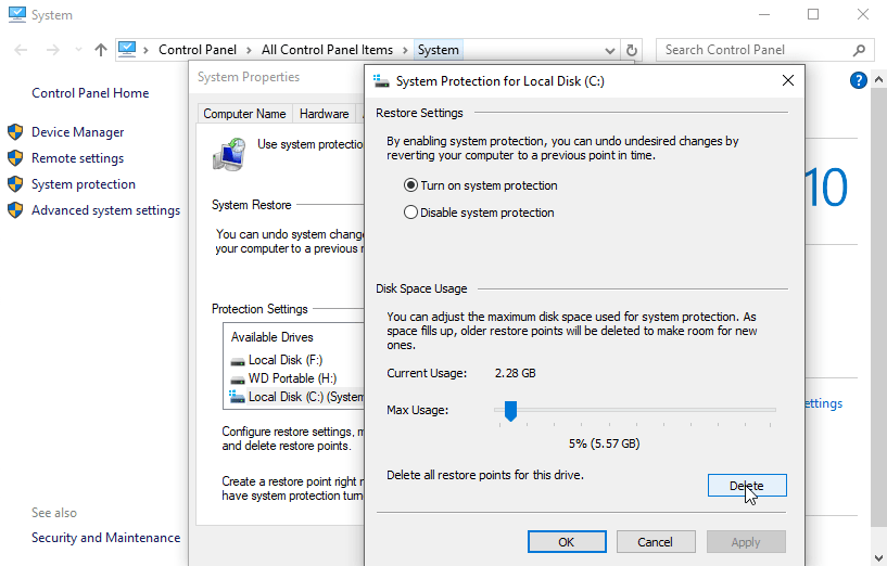 3. Fare clic su Delete e confermare l'opzione per eliminare tutti i punti di ripristino su questa unità.