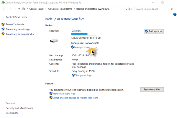 Fare clic Start e selezionare Settings > Update & Security > Backup > Go to Backup and Restore (Windows 7) per aprire il vecchio strumento di backup dell'immagine. Fare clic su Gestisci spazio.