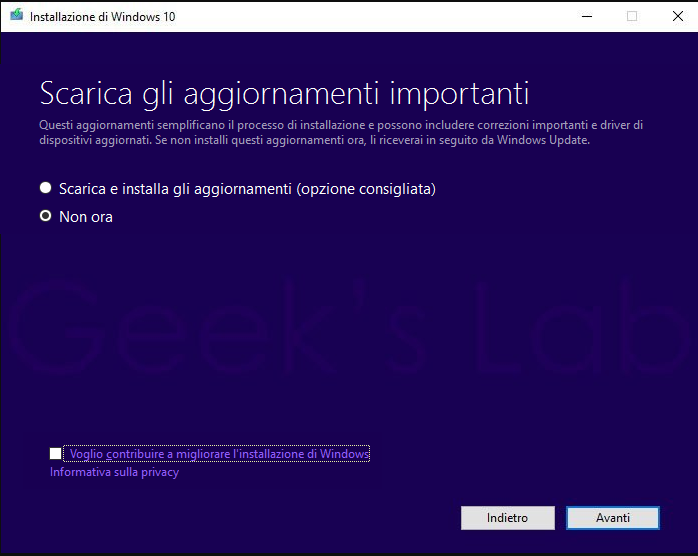 3. Quando la procedura di Installazione di Windows 10 è pronto, puoi decidere se Scarica e installa gli aggiornamenti o Non ora in base alle tue esigenze.
