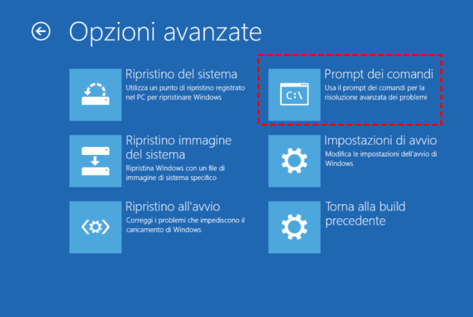NOTA: Se non è possibile avviare Windows anche con la modalità provvisoria, puoi aprire il Prompt dei comandi nel menu Opzioni avanzate.