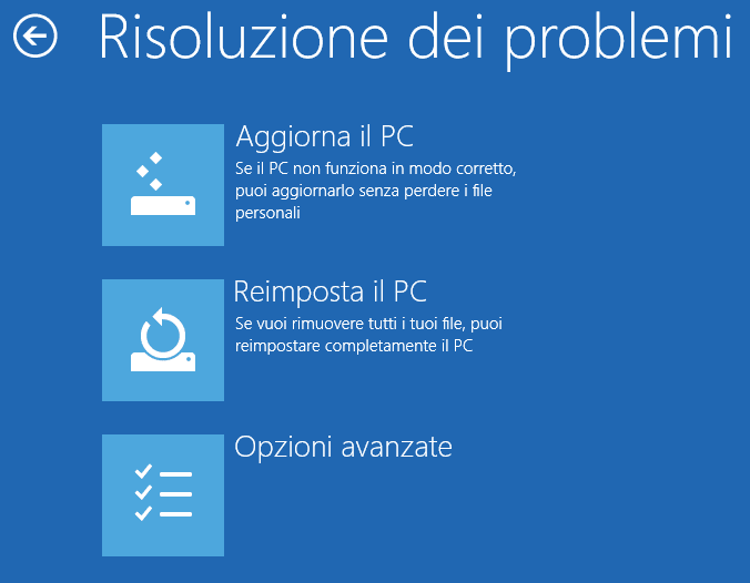 * Se il sistema non è in grado di avviarsi, basta avviare la modalità di ripristino e selezionare Risoluzione dei problemi > Reimposta il PC.