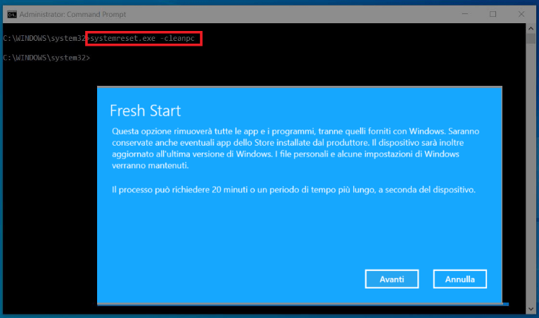 Per ripristinare Windows 10/11, digita "systemreset -cleanpc" in un prompt dei comandi con privilegi elevati e premi Enter/Invio.
