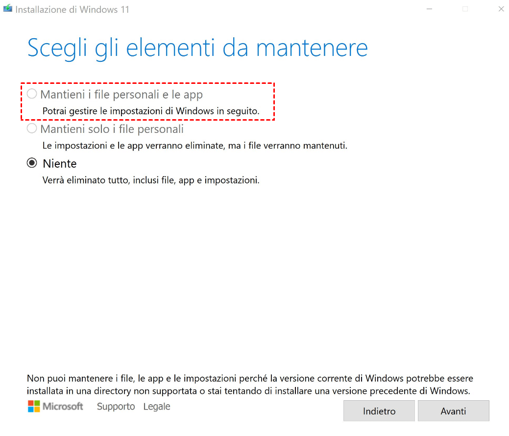 Nota: Se desideri aggiornare Windows 11 senza perdere dati, devi selezionare la prima opzione. Mentre se desideri eseguire un'installazione pulita, seleziona la seconda opzione.