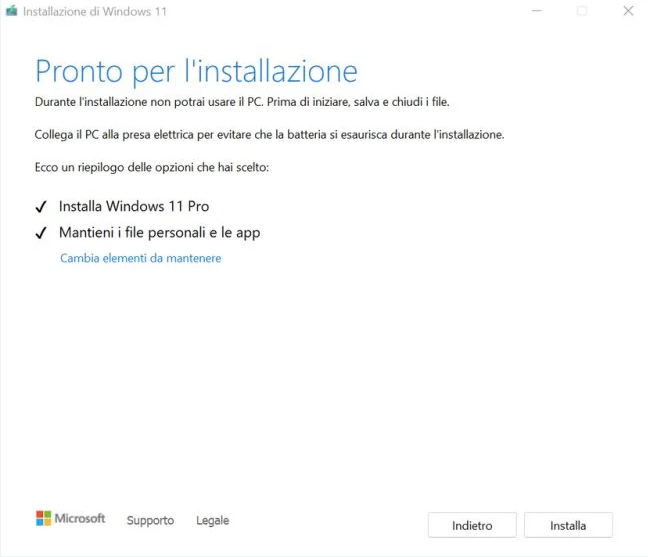 Passo 6. Quando viene visualizzata la finestra in basso, fai clic sul pulsante Installa per reinstallare Windows 11. Se si desidera modificare il tipo di file che si desidera conservare, è possibile fare clic su Cambia elementi da mantenere.