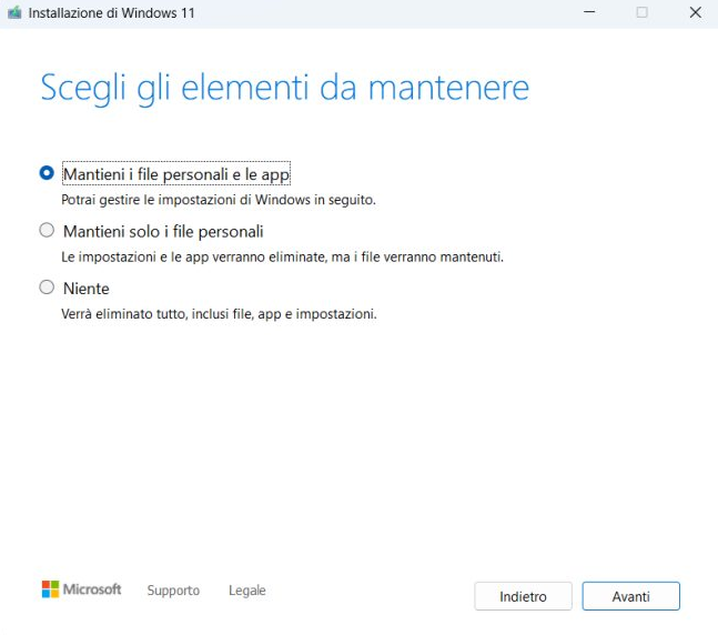 - Se desideri apportare delle modifiche, fai clic sul collegamento Scegli cosa mantenere per ottenere l'interfaccia seguente e seleziona una delle opzioni in base alle tue esigenze.