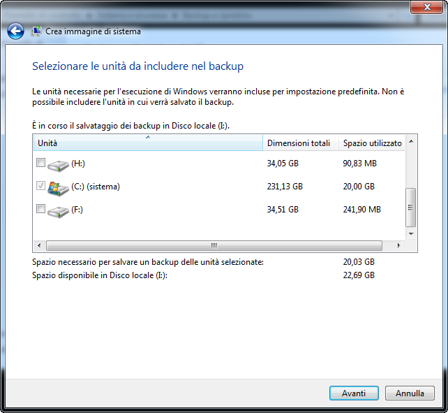 Nota: in questa finestra è possibile includere anche altre partizioni. Tuttavia, tieni presente lo spazio necessario per salvare un backup delle unità selezionate e la destinazione del backup. Se lo spazio delle unità selezionate supera lo spazio sul disco di destinazione, il backup del sistema non è riuscito alla fine a causa di spazio su disco insufficiente.