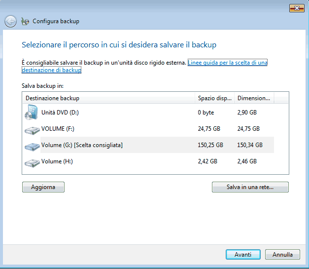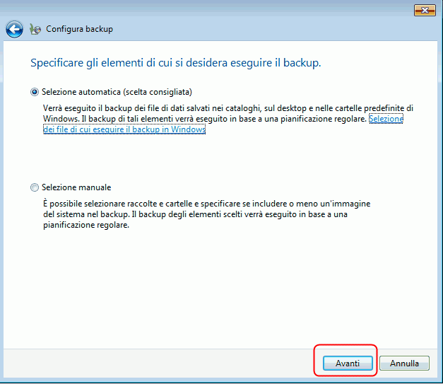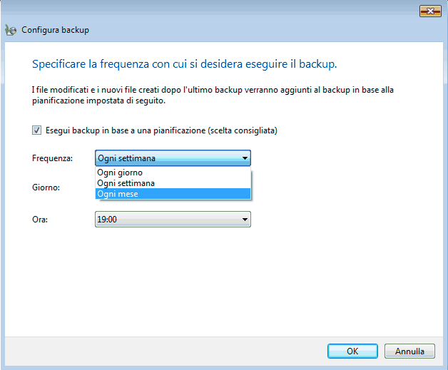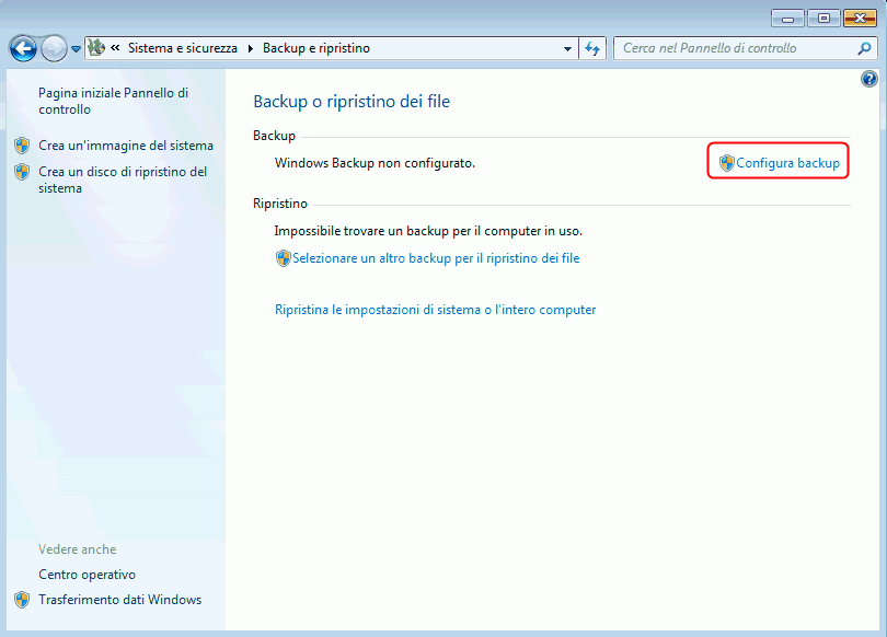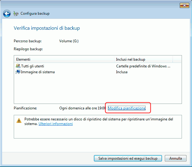 Per configurare backup automatici, è possibile utilizzare l'utilità di Windows 7. Se non hai mai utilizzato Windows Backup in precedenza, Windows Backup crea automaticamente una pianificazione per te, che puoi modificare. È possibile seguire i passaggi seguenti per impostare un processo di backup programmato:
