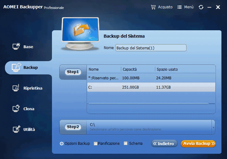 2. Clicca “Backup” pulsante epoi va “Backup del Sistema” nello schermo seccessivo.