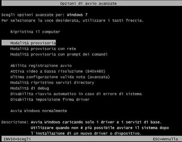 Usa i tasti freccia per selezionare Modalità provvisoria o Modalità provvisoria con rete premere ENTER.