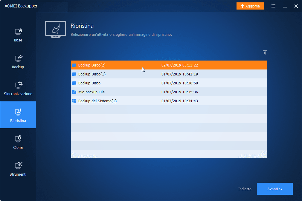 Ecco un software di terzo partito gratuito – AOMEI Backupper Standard, consente di backup pc su hard disk esterno e ripristinare il sistema allo stato precedente anche se non è possibile avviare il computer. Puoi creare disco avviabile da AOMEI. E consente di ripristinare il sistema su un altro computer con hardware diverso utilizzando la funzione Ripristino Universale(Questa funzione è disponibile in edizione avanzata).