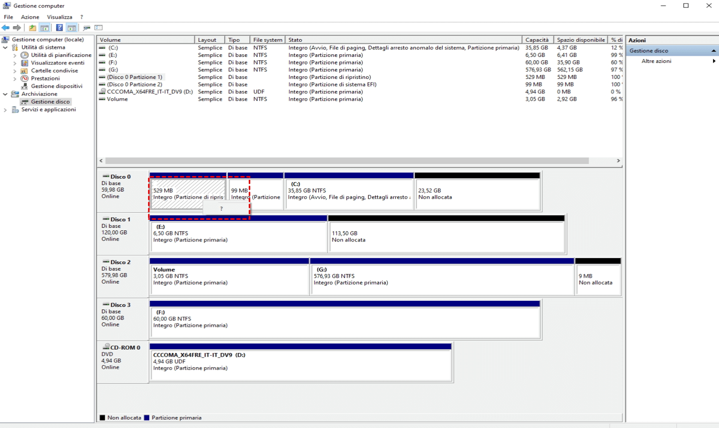 La partizione di ripristino è una partizione speciale sul disco, che aiuta a ripristinare le impostazioni di fabbrica del sistema operativo in caso di problemi di sistema. Non esiste una lettera di unità per questa partizione e in Gestione disco è disponibile solo un'opzione Aiuto visualizzata come l’icona ?.
