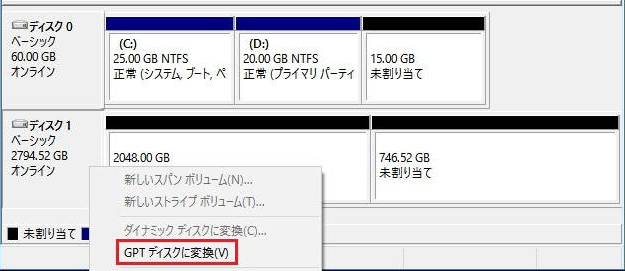 「ディスクの管理」には、ディスク変換という機能があります。しかし、この機能は空のディスクしか変換できず、そうでない場合は、「GPTディスクに変換」オプションが利用できません。