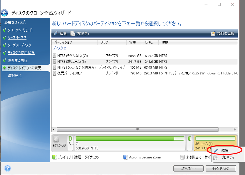 HDDをより大きなSSD/HDDにクローンすることができます。「パーティションを編集」により、クローン完了後、クローン先のディスクに使えない未割り当て領域が作成されません。