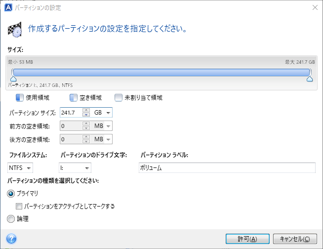 セクター単位のクローン:ソースディスクが使用されているか、空白であるか、不良セクターであるかに関係なく、ソースディスク上のすべてのセクターをクローンできます。※「パーテイションを編集」と同時に使えません。