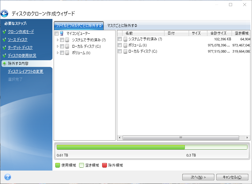 手順 6. 「除外する内容」で、クローンから除外するパーティションやファイル/フォルダを指定できます。特に除外するものがなければ、そのまま「次へ」をクリックしてください。