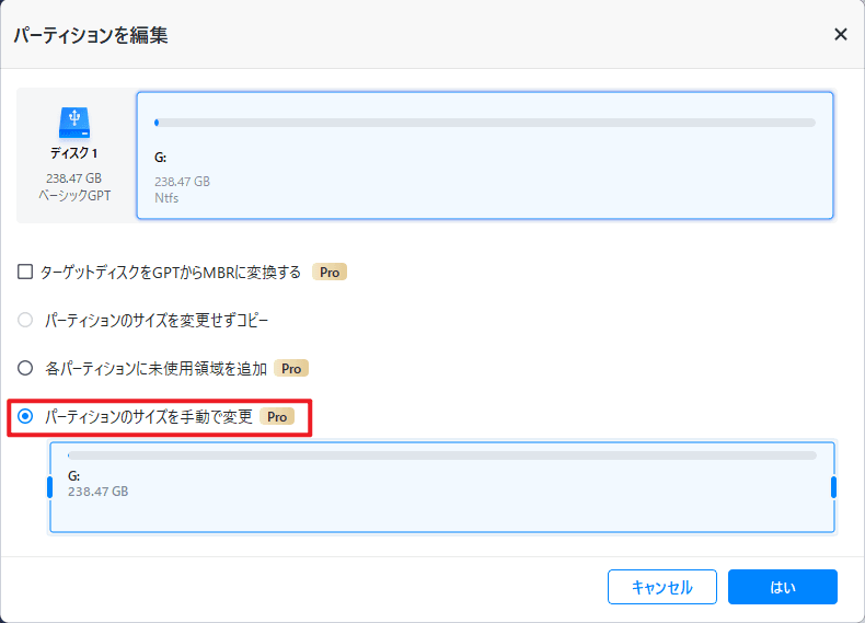 パーティションを編集:クローン先のディスクはクローン元のディスクより大きい場合、容量を最大限に活用するには、このオプションで、「パーティションのサイズを手動で変更」または「各パーティションに未使用領域を追加」の2つオプションから、パーティションのサイズを調整できます。クローン完了後、クローン先のディスクに使えない未割り当て領域がないことを確保できます(AB Proで利用可能)。