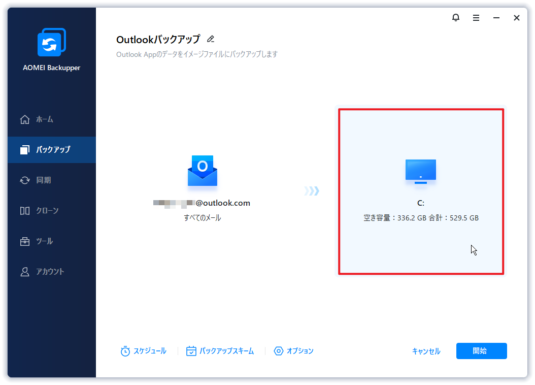 5. メールボックス全体を選択したことを確認し、「開始」をクリックすると、Outlookのメールなどがすべてバックアップされます。