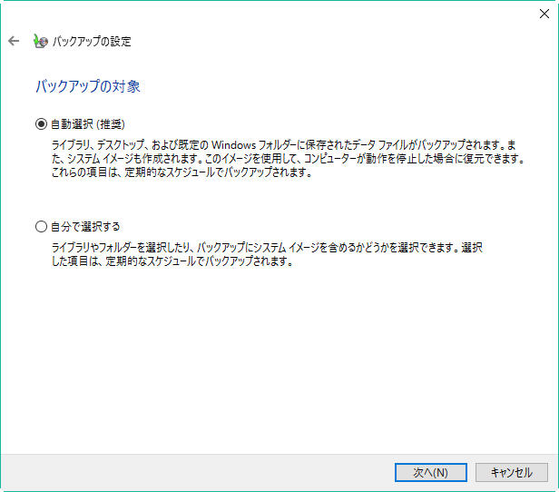 3. 次にバックアップの対象を選択します。良く分からなければ「自動選択」で良いでしょう。そして「次へ」をクリックします。