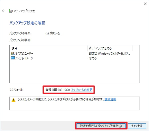 4. バックアップ設定の確認画面が表示されます。デフォルトで毎週日曜日午後7時にバックアップを実行しますが、このスケジュールをキャンセルできます。或いは「スケジュールの変更」を押下して、必要に応じてスケジュールの設定を変更できます。バックアップ設定に問題なければ、「設定を保存してバックアップを実行」ボタンをクリックしてWindows 10バックアップを実行します。