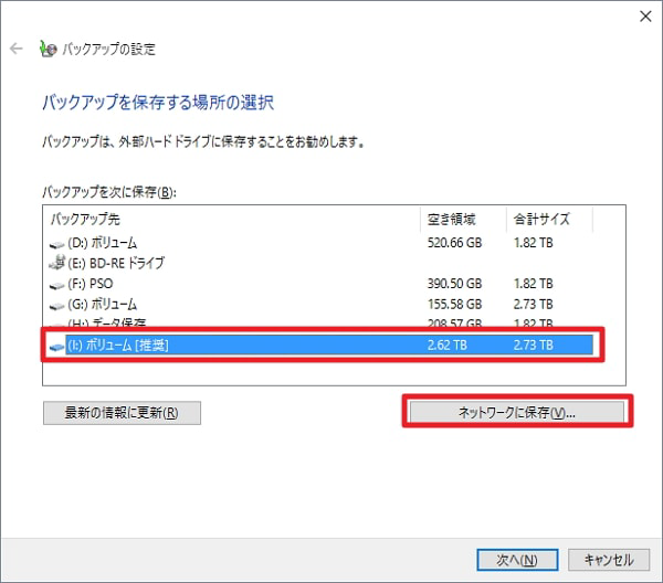 2. バックアップデータの保存先を指定します。Lenovoノートパソコン内の別HDDを選択できますが、一番良いのは外付けHDDを選択することです。バックアップ用のドライブを選択したら、右下の「次へ」をクリックします。