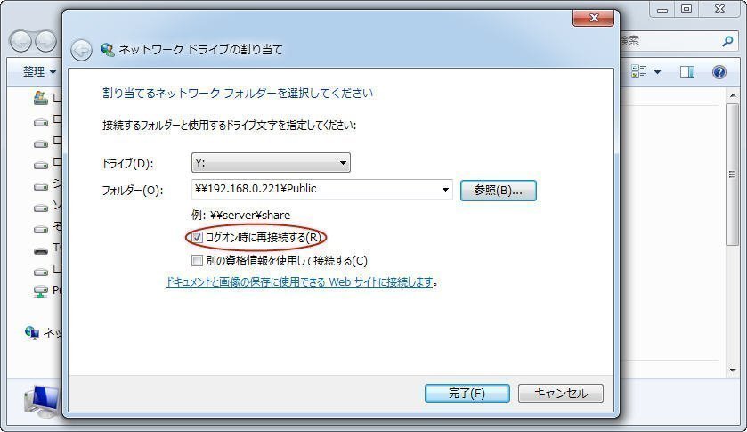 手順 2. 次に、NASにドライブ文字を指定し、「ログオン時に再接続する」にチェックを入れ、「完了」をクリックし、設定を保存します。