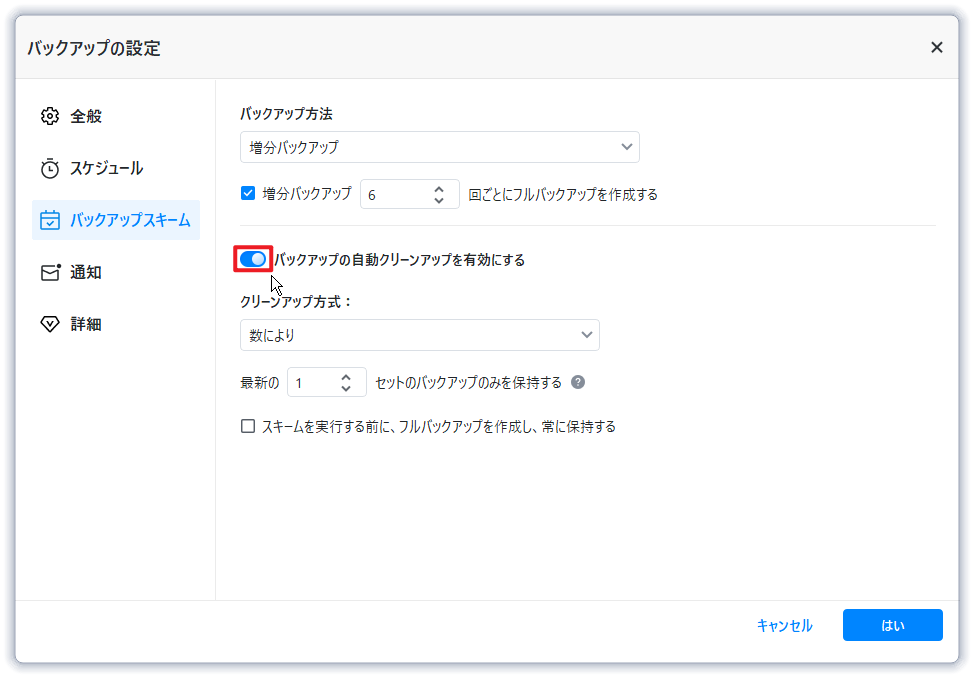 👉 スキーム:この機能(Professional版で利用可能)は、バックアップディスクスペースを節約するために古いバックアップイメージを自動的に削除することができます。