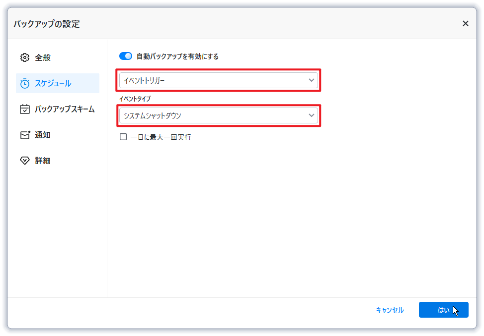 3. 「スケジュール」をクリックし、「自動バックアップを有効にする」スイッチをオンにして、ドロップダウンから「イベントトリガー」を選択します。そして、「システムシャットダウン」を選択し、「はい」をクリックします。*必要に応じて、「一日に最大一回実行」にチェックを入れることができます。