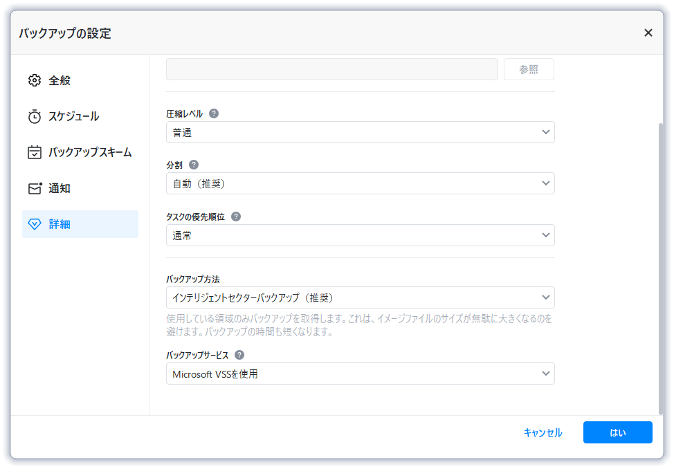 オプション:バックアップイメージの圧縮レベル/暗号化、バックアップ完了後のメール通知、「インテリジェントセクターバックアップ」/すべてのセクターをバックアップする「完全なバックアップ」などを設定することができます(バックアップの暗号化はProfessional版で利用可能)。
