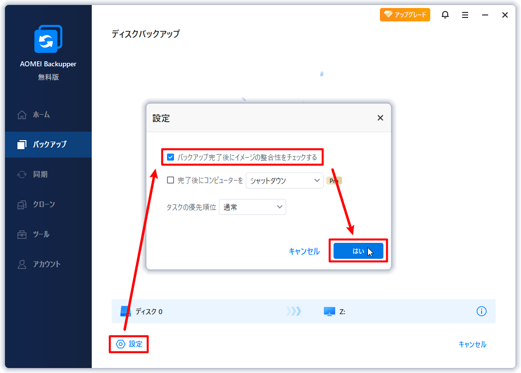 5. バックアップを開始したら、歯車アイコンをクリックし、「バックアップ完了後にイメージの整合性をチェックする」にチェックを入れて「はい」をクリックします。そのままバックアップが完了するまで待ちます。処理中も、通常どおりPCを使用できます。