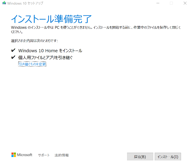 ステップ 6. 引き継ぐものを変更したい場合、「引き継ぐものを変更」をクリックします。「インストール」をクリックし、Windows 10のインストールを開始します。
