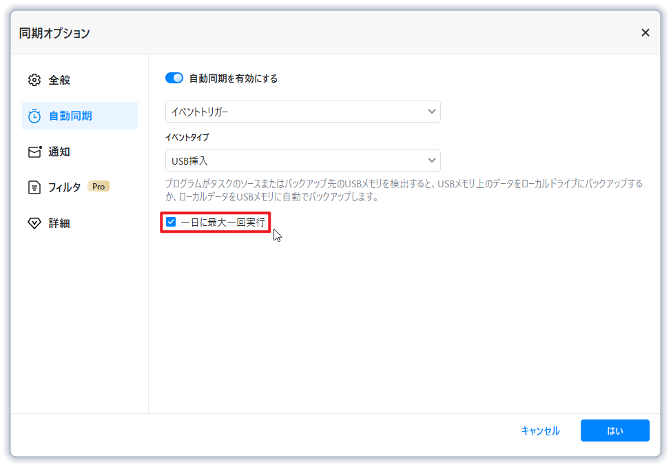USB挿入は、同期タスクに関連付けられたソースまたはターゲットのUSBデバイスが接続されると、プログラムが自動的にデータをUSBデバイス間で同期します。