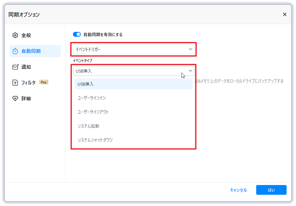 AOMEI Backupperでは、5つのイベントトリガー・タイプ(ユーザーサインイン、ユーザーサインアウト、システム起動、システムシャットダウン、USB挿入)を提供しています。イベントタイプを指定し、選択されたイベントが発生する時同期タスクを自動的に実行します。