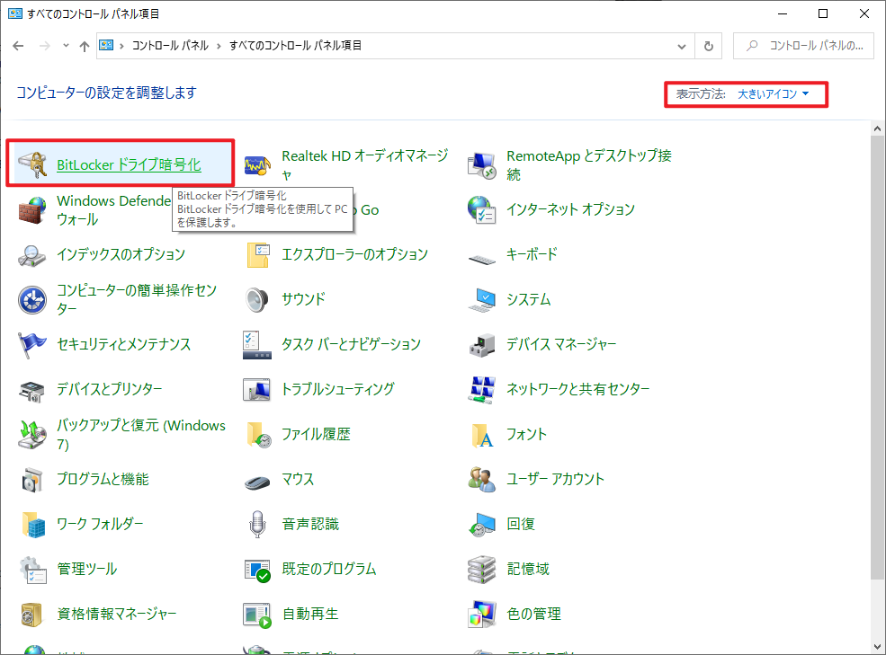 「設定」から「BitLockerの設定」が見つからない場合は、「コントロールパネル」→「表示方法」の「大きいアイコン」/「小さいアイコン」→「BitLockerドライブ暗号化」に移動してください。